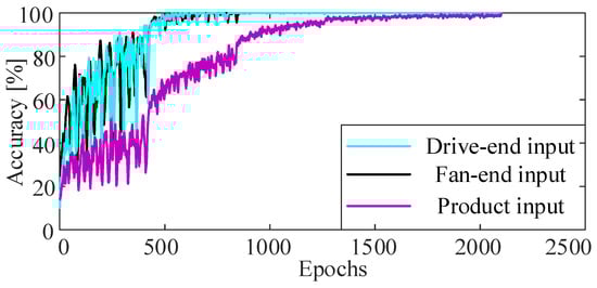 To investigate the impact of different input datasets on model performance, two separate approaches are taken: using drive-end data exclusively and fan-end data exclusively as one-dimensional time series inputs. Additionally, a comparative test is conducted by multiplying the acceleration data measured at the same sampling instant from both the drive-end and fan-end, which serve as the input data. The training process of the model is illustrated in Figure 7.