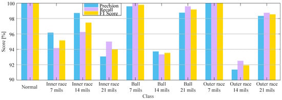 Observations indicate that the model converged most rapidly when using drive-end data, followed by fan-end data. Both achieved 100% accuracy on the validation set after 1000 epochs, while the product input failed to converge even after the completion of training. Table 2 and Figure 8 demonstrate the performance of the model trained using drive-end data as input on the test set, where the confusion matrix, precision, recall, and F1 score are illustrated. Notably, for various types of faults, the precision ranges from 91.36% to 100%, the recall rates vary from 92.50% to 100%, and the F1 scores fall between 91.93% and 100%. Overall, the accuracy rate is approximately 96.96%, where 2327 out of 2400 test samples are correctly judged, even though the training set excludes inputs from the 0 hp scenario. This suggests that the model, trained solely on drive-end data, exhibits strong generalization capabilities and can accurately predict outcomes in unseen scenarios.