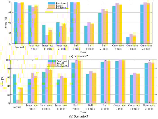 In Scenario 3, when the model is trained at 48 kHz, but some input samples have a sampling rate of 12 kHz, there is a notable decrease in the model’s generalizability. Comparing the results of Case 1 and Case 3, it can be observed that when all other conditions remain unchanged and only the sampling rate of the prediction data for the bearing under normal operation is reduced to 12 kHz, the recall rate of label 0 drops significantly to approximately 77.1%. This suggests that a portion of the measurement signals during normal operation have been falsely classified as other types. Consequently, the overall accuracy of Case 3 decreases from approximately 97% to 94%, almost reaching the same level as Case 2. Nevertheless, the precision rate of label 0 remains at a high level, indicating that fault conditions of other types are rarely misclassified as normal operation, as the sampling rate for these faults remains at 48 kHz.