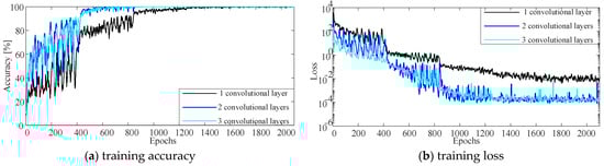 The findings indicate that when the number of convolutional layers is limited to 1, the convolutional neural network lacks the necessary depth to effectively extract spatial and temporal information from the GASF and GADF images resulting from polar coordinate transformation. As a result, the accuracy improvement during training is slow and remains unstable even after 1200 epochs. Additionally, the decrease in loss with increasing epochs is relatively gradual, culminating in maximum, minimum, and median test accuracies of only 87.90%, 85.88%, and 84.22%, respectively, as shown in Figure 11. In contrast, when the convolutional layers are increased to 2 or 3, the parallel DCNN demonstrates strong convergence during training, with a rapid decrease in the loss function to the order of 10−4. Under a large number of test samples, no significant differences are observed in the maximum, minimum, or median test results between these two configurations. Given their comparable performance, simpler network structures are preferred to enhance real-time capabilities.