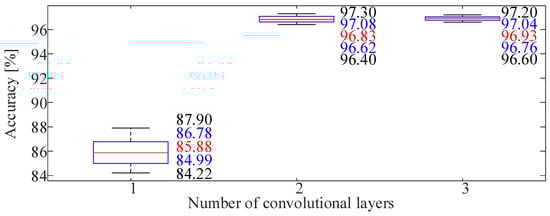 Modifications are made to the architecture of the established parallel DCNN to further assess the fault diagnosis capabilities of the proposed method across varying network structures. Specifically, the convolutional layers are fixed at 1, 2, and 3 while maintaining consistent conditions, as outlined in Figure 3. This entails optimizing the hyperparameters for each convolutional layer count to ensure the representation of the highest fault diagnosis accuracy achievable in each scenario.