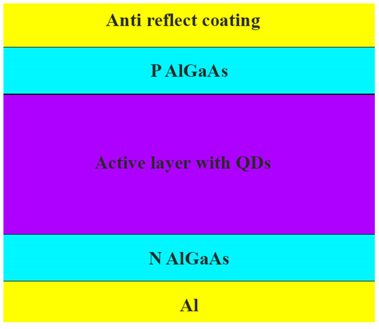There are several ways to improve the efficiency of solar cells. Using materials with high light absorption and low series resistance can increase the current and efficiency [42]. Other types of thin-film solar cells are currently under development to tackle the issue of using expensive and rare metals such as indium (In), gallium (Ga), and arsenide (As), which are presently being used in the two most common thin film technologies. These new types of cells aim to reduce the cost of mass production and make solar energy more affordable [43]. Another approach is to incorporate QDs in the active layer and utilize an extensive bandgap material, as well as a window for passing the electron and hole to the electrodes. Figure 1 shows the solar cell structure [2].