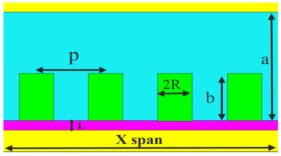Cell efficiency is affected by the shape and number of QD layers. However, the QD’s dimensions and the impact of the other variables must be discussed. In general, changes in dimensions, including radius, height, and the volume occupied by QDs in the cell, can have a positive or negative effect on various characteristics of the cell, including optical characteristics, which for QDs include variables such as the radius and distance between the centers, and the type of their arrangement inside the active layer is of particular significance. Dimensions of cylindrical QDs in this structure are shown in Figure 2.