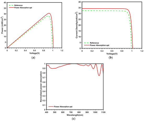 Characteristics of (a) power versus voltage, (b) current density versus voltage, and (c) power absorption of the proposed QD-IBSC for power absorption optimization.