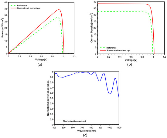 Characteristics of (a) power versus voltage, (b) current density versus voltage, and (c) power absorption of the proposed QD-IBSC for short-circuit current optimization.