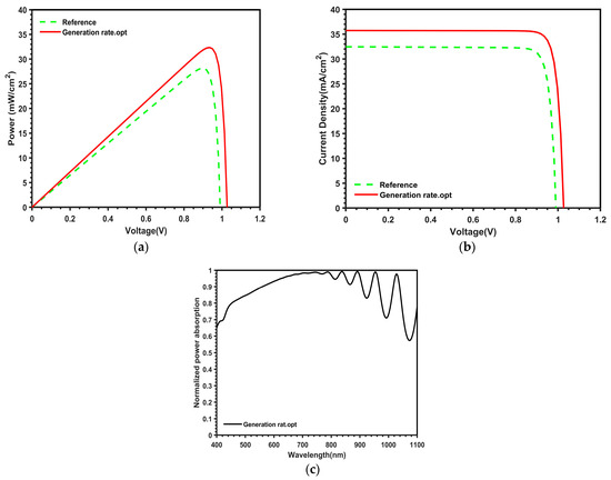 Characteristics of (a) power versus voltage, (b) current density versus voltage, and (c) power absorption of the proposed QD-IBSC for generation rate optimization.
