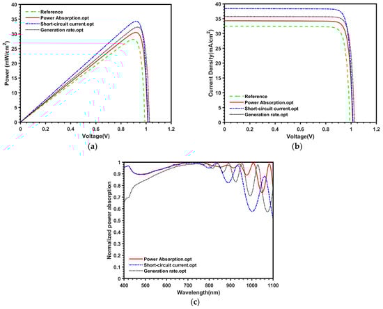 Comparison of results for the proposed QD-IBSC under three optimization conditions with the optimal condition; (a) power versus voltage, (b) current density versus voltage, and (c) normalized power absorption versus wavelength.