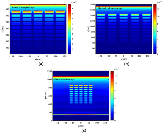 Two-dimensional absorption profiles under three optimization conditions: (a) power absorption, (b) short-circuit current, and (c) generation rate.