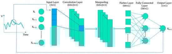 CNNs are deep learning models designed especially for image recognition and processing tasks [29]. Time series data, which can be viewed as a 1-dimensional grid with regular time intervals, and image data, which can be viewed as 2-dimensional pixels, can be successfully processed with CNNs. CNNs consist of various layers, including an input layer, convolution layer, pooling layer, ReLU layer, fully connected layer, and output layer. The input layer receives the data and passes it to the convolution layer. In this layer, filters are utilized to extract targeted nonlinear models from the input data, resulting in feature maps. The pooling layer is utilized to downsample these feature maps. Then, the pooling layer converts the multidimensional shape of the feature maps into a one-dimensional shape and then sends it to the fully connected layer. The fully connected layer calculates the final results based on these features [30,31]. Figure 3 shows an example of a CNN used for time series forecasting, where a univariate time series is used as input, and the output represents a forecast.
