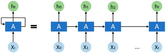 An RNN is a type of deep learning architecture and is called a recursive neural network [18]. In neural networks other than RNNs, inputs are handled independently of each other. The order in which the inputs arrive in the network does not matter. After the processing of the input in the network is completed and the output is produced, the neural network forgets the input. In areas such as image processing, one input can be provided at a time. However, data such as weather cannot be input to the network at once. For this reason, RNNs, which are neural networks with memory, have been produced as a solution. RNNs progress by keeping the information of the previous data in memory while training the network. Therefore, it can be successfully used in SoC predictions of LIBs containing time series data. SoC time series data provided to an RNN are processed step by step in the inner loop of the network, and an output is produced. During this process, information from the previous layer (hidden state) is updated and transferred to the next layer through repeating layers. Figure 4 shows the internal structure of the RNN architecture.