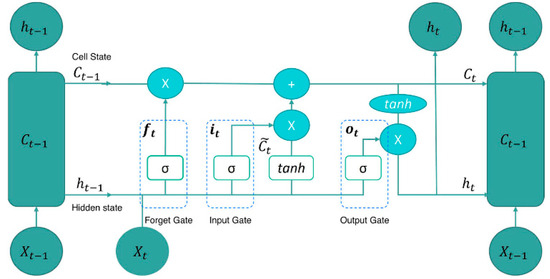 In examining an RNN, it is seen that predictions for the future are made using past experiences. If transactions are made within a large network and we are trying to process a long paragraph or history-dependent data, the value we will obtain will increase exponentially. This may cause an increasing gradient explosion. As a solution to this problem, LSTM [18] and GRU [31] models, which are specialized versions of RNNs, have been proposed. The LSTM network architecture consists of four neural networks and special memory blocks known as cells. By default, the LSTM network is designed to retain information for long periods of time. Operations in the LSTM are performed by three gates. The first of these is the forgetting gate , the second is the entry gate , and the last is the exit gate . These gates determine the importance of information and decide what should be kept or discarded. LSTM cell consists of two main blocks. The first of these is the cell state and the hidden state . These states are constantly updated and carry information from previous time steps to the present. While the cell state acts as a store for long-term memory, latent states serve as a store for short-term memory. The architectural structure of an LSTM network is shown in Figure 5.