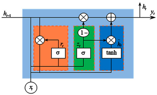 A GRU neural network is an improved model of an RNN that exhibits superior long-term sequence memorization capabilities compared to the standard RNN. It functions similarly to LSTM in solving the gradient explosion or disappearance problem of simple RNNs. Unlike LSTM, in GRU, the forget and input gates are synthesized into a single update gate and only one hidden state is processed to transmit information. A GRU can be thought of as a different version of LSTM with an easier design, fewer variables, and higher convergence. The GRU base unit consists of an update gate and a reset gate. The update gate decides how much of the new candidate state should be added to the existing hidden state. The output of the previously hidden layer has a large impact on the current hidden layer. The purpose of the reset gate is to manage how much of the previously hidden state should be forgotten; a smaller value indicates that more information has been ignored, thus reducing the dependence on past information. The basic architecture of a GRU is shown in Figure 6.