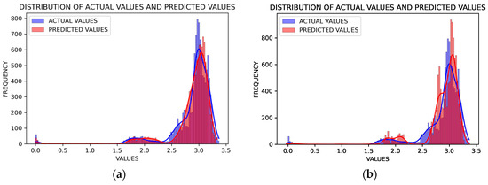 Distribution of actual values and predicted values produced by RF (a) and XGBoost (b) models.