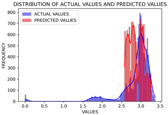 In examining Table 5, RF achieved better results. It is desirable for the MSE to be low, and a good regression model should have low MSE values. However, the absolute value of MSE alone is not always sufficient for evaluating the quality of a model. Therefore, it should be evaluated together with other metrics. In the examinations, the low R-squared value of RF means that the model can explain only a small part of the variance of the independent variables on the dependent variable. This indicates that the model has weak explanatory power. The RMSE, on the other hand, always depends on the problem and data context. The datasets used in these experiments may have higher RMSE values because the dataset inherently had more variance. Therefore, data characteristics and problem requirements should be taken into consideration while interpreting the RMSE value. Based on this information, it can be predicted that XGBoost can achieve better results when there are more dependent variables. However, preliminary results showed that RF achieved better results. Figure 8 illustrates the actual values produced by the RF and XGBoost models and the distribution of the predicted values.