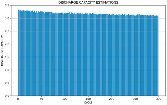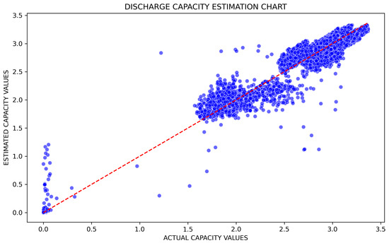 The most important disadvantage of machine learning models is that there is no standard way to determine model parameters. Model parameters were chosen based on default values that are widely accepted. These parameters may vary depending on the dataset and problem used, and similar parameters used as much as possible in order to better evaluate the common results of different models. When the results were examined, it could be seen that RF is the most successful method among the different models created for estimating the discharge capacity of batteries. The fact that the RMSE and MAE values were close to zero and the R-Squared value was close to 1 showed that our proposed model is more successful. In addition, when the POCID and other evaluation criteria were examined, it was seen that the RF model was more successful than other machine learning models and minimized the prediction error. Based on the experiments conducted with the RF machine learning model, an estimation graph is shown in Figure 10, and a discharge capacity estimation graph is shown in Figure 11.