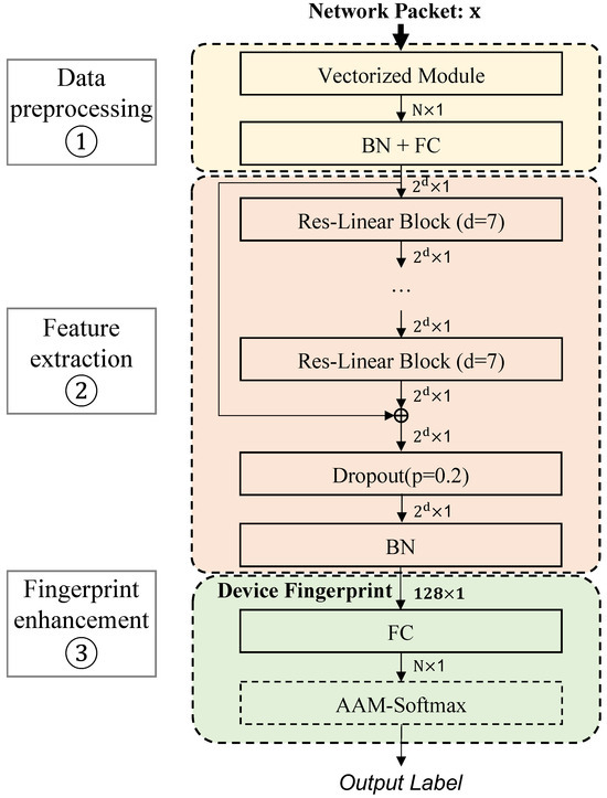 Many research areas leverage deep embedding techniques to create fingerprints, such as voiceprints [25,26,27] in speaker verification and faceprints [28,29] in face recognition. Typically, the general workflow involves the development of a feature extractor and a classifier. Subsequently, a suitable objective function is designed to classify samples of different types. After extensive training, the network becomes proficient at correctly classifying samples, and the embedding obtained before the classifier serves as the fingerprint.