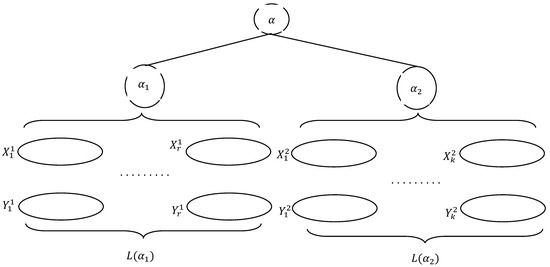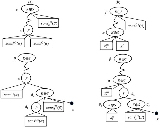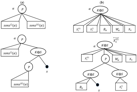 It is evident that step 1 runs within time, as only a maximum of nodes are marked. Furthermore, we can assume that for every node in the tree , the set of its sons that are marked by , by , or by has been calculated. So, finding the set also requires operations. Suppose that . We can check whether one of the two nodes of is a grandparent of the other as follows: Choose an element of and start to mark the parent of this element, then mark the parent of the parent, and so on until the other element of is marked or until the root of is marked. For the last case, that is, if the root of has been marked, we repeat this process for the other element of . In this manner, we can also determine the node , the lowest node marked by , and the grandparent . This process can be conducted in mark operations.