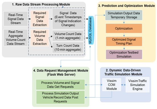Smart corridor Digital Twins are typically driven using real-time and historic vehicle and infrastructure data from the corridor [,,]. In this study, the Digital Twin is developed using vehicle real-time and historic volume count, turn count, and Signal Phasing and Timing (SPaT) data available from approximately 2.1 miles of Martin Luther King (MLK) Smart Corridor, Chattanooga, TN, USA, consisting of 11 signalized intersections. A smart corridor Digital Twins model architecture typically includes four key components as shown in Figure 1: