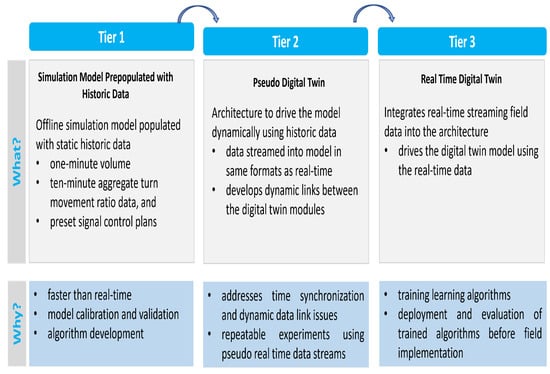 Smart corridor Digital Twins development requires integration and synchronization of multiple components within the Digital Twins architecture described in the previous section. This makes Digital Twins development a time-consuming process susceptible to coding, integration, implementation, data processing, and other errors. To tackle this, in this study a three-tier incremental approach is used that allows a parallel workflow. The Digital Twins development process is broken into three tiers with increasing communication and infrastructure integration complexity. Such an approach enables training and testing of Machine Learning/Reinforcement learning-based (ML/RL) applications early on, on the initial tiers, thus, reducing the wait time required for the development of a fully operational real-time Digital Twins. Such an approach enables the training and testing of ML/RL-based applications such as signal timing optimization developed in this paper, on initial tiers rather than waiting for the completion of the full real-time Digital Twins, thereby expediting the overall study timeline. A detailed description of the incremental approach for Digital Twin development, as shown in Figure 2 is found in [].