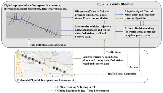 Due to the Digital Twin’s ability to behave as a real-time environment with different static and dynamic properties, it can be used to assist deep learning algorithms like training autonomous cars [], real-time adaptive, precision-centric, predictive traffic monitoring [], and Reinforcement Learning (RL) algorithms like edge task scheduling [], intelligent manufacturing systems [], and in vehicular edge computing []. To learn the dynamic traffic flow behavior and make better decisions in real-time through adaptive signal control [], reinforcement learning algorithms can have better assistance through Digital Twin. The Digital Twin can use data from various transportation components, including vehicle presence time in the detector zone which refers to the elapsed time from when vehicles enter the detector zone until they leave, approaching vehicle counts, and pedestrian recall, to create a comprehensive representation of the transportation system. This enables Reinforcement Learning (RL) agents to learn traffic flow behavior and perform various actions in the digital environment. Moreover, the ability of multiple agents to interact with the same environment and coordinate with each other can lead to better decisions and improved traffic flow. The use of Digital Twin with Reinforcement Learning (RL) agents increases efficiency in decision-making and enables agents to observe their performance for future decisions.
