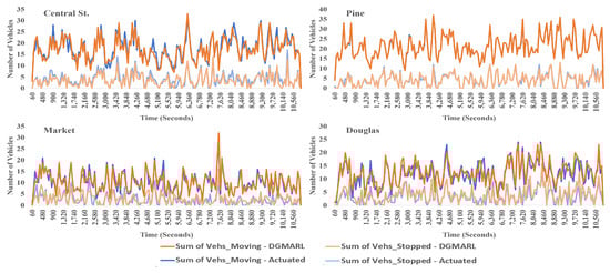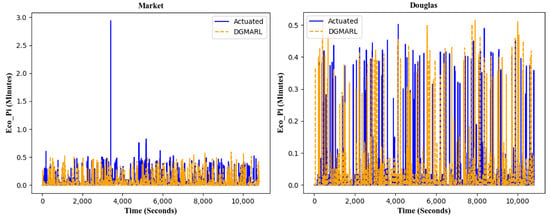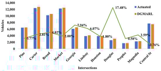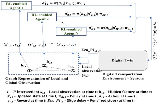 The study [] underscores the critical importance of accurate simulation models in urban transportation planning and optimization, and highlights the necessity of capturing the complexity of city traffic for effective planning by utilizing real-world vehicle speed data and integrating various sources. As the urban landscape evolves, the integration of Digital Twins, inspired by Industry 4.0 principles [,,,,,,,,,,,,,,,], emerges as a transformative element in modernizing systems and processes. Digital Twins offers a promising paradigm to enhance the performance of physical systems through virtual modeling [,,,]. The marriage of Digital Twins with Multi-Agent Reinforcement Learning (MARL) for traffic signal optimization marks a paradigm shift in urban traffic management. Digital Twins serve as virtual representations of physical entities, providing real-time monitoring, analysis, and decision-making capabilities. Studies such as [] investigate the transformative impact of Digital Twins, Internet of Things (IoT), and machine learning on data utilization, underscoring the potential of Digital Twins in enhancing real-time data utilization for enterprises. Continuously updated in real-time through sensor data and various sources, the Digital Twins provides an accurate depiction of the current and historical state of the physical entity, allowing for improved prediction, control refinement, and operational optimization [,]. Diverse applications of Digital Twins, including transportation, modeling techniques, and the benefits of integrating Digital Twins in system design, have been discussed in [,].