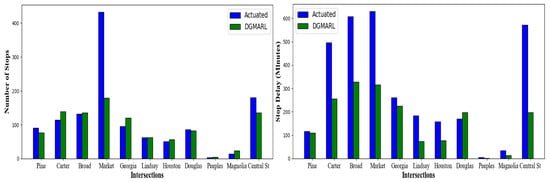 - Multi-Agent Architecture for Scalability: Multiple agents, operating independently, optimize traffic signal timings at different intersections within the network. Asynchronous communication protocols, including message passing and attention mechanisms, reduce communication overhead []. Distribution of workload and efficient utilization of local data enhance scalability for larger volumes of data and intersections [,,].