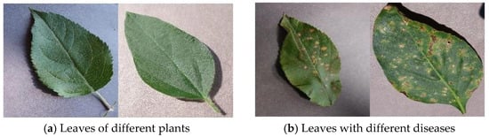 Agriculture is a critical industry that significantly impacts the economic development of a country and the living standards of its people [1]. However, the productivity of this industry is often impeded by the persistent threat of pests, bacterial and fungal viruses that adversely affect important crops. The hindrance to increasing agricultural productivity is significant and requires proactive measures to mitigate the effects of these challenges. In order to safeguard plant health, there is a need to focus on enhancing the prevention and treatment of pests and diseases that affect plant leaves [2]. The integration of deep learning technology into the agricultural field has revolutionized the identification of plant leaf diseases, making it one of the most vital tools for the diagnosis and control of plant diseases [3] and ensuring crop safety. While traditional convolutional neural network (CNN) [4] models are highly effective in identifying a few easily distinguishable types of plant diseases by extracting global features, they face significant challenges when dealing with a diverse range of similar plant disease species. The limited ability of traditional CNN models to extract only global features makes it difficult to distinguish between similar diseased leaves or similar healthy plant leaves [5], as shown in Figure 1. Figure 1a shows that different plants have similar leaves, and Figure 1b shows that different diseases have similar symptoms. To overcome this challenge, extracting local features has become an essential means to distinguish between different plant leaves, and the efficient and accurate extraction of local features is the core focus of this research.