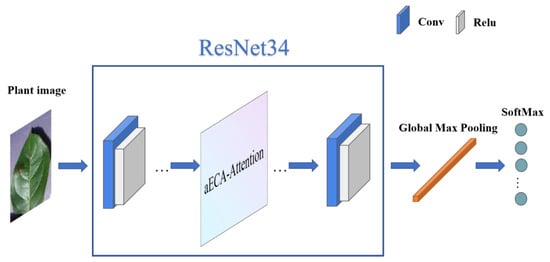 In order to extract the local features of plant leaves, the attention mechanism is introduced, and the combination of both improves the accuracy of plant leaf pest and disease classification. The network architecture is shown in Figure 2, which can be seen to contain ResNet34 and the improved channel attention mechanism, aECA-Attention network. As can be seen from Figure 2, the blue rectangular block represents the convolution block, the gray rectangular block represents the Relu activation function, and the diamond-shaped module represents the improved aECA-Attention network module. The peanut leaf images are input first and their global features are extracted through a series of convolutions [26], the aECA-Attention module is added in ResNet34 to extract the local features, then the feature texture is extracted through Global Max Pooling to reduce the influence of useless information, and finally, the classification results of this image are output through the Softmax function.