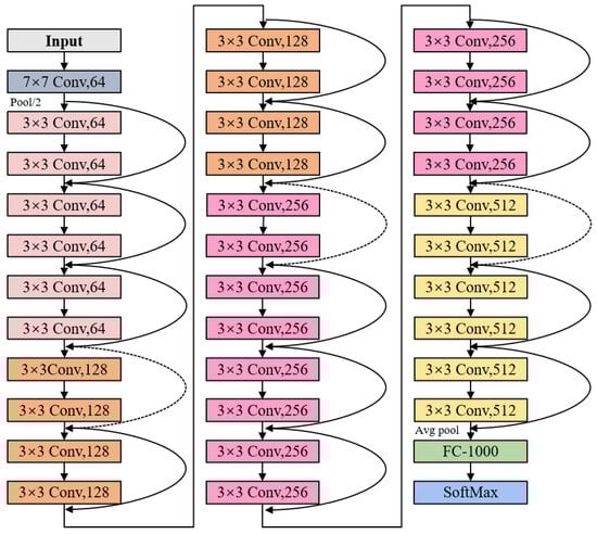 With the increase in the number of layers, the weight matrix degrades and the ability to learn features decreases, which may lead to the symmetric state of the network. In order to solve this problem, ResNet is a residual network structure proposed by Kaiming He et al. [27]. It proposed a new concept breaking the symmetry of the neural network: a Shortcut Connection. Not only does this successfully solve the problem of gradient vanishing and gradient explosion, but it also significantly enhances the training efficiency and performance of deep neural networks, which further promotes the development of deep learning technology. ResNet was proposed with different layers of network models, such as ResNet18, ResNet50, ResNet101 [28,29,30], etc. In this research, the ResNet34 network is used, and its structure is shown in Figure 3. First, the image size 224 × 224 is input into a convolution layer with a convolution kernel size of 7 × 7, 64 convolution kernels, a step size of 2, and padding of 3, and the output is 64 × 112 × 112. Then, after a pooling layer with a pooling core size of 3 × 3, pooling core numbers of 64, a step size of 2, and padding of 1, the output is 64 × 56 × 56. In addition, it is worth noting that there are two kinds of connecting lines in the figure: solid lines and dashed lines. Solid lines indicate that the input and output dimensions are the same, and the calculation method is to add them directly; dashed lines indicate that the input and output dimensions are different and cannot be added directly, and the calculation method is to convolve the input image by 1 × 1 first.