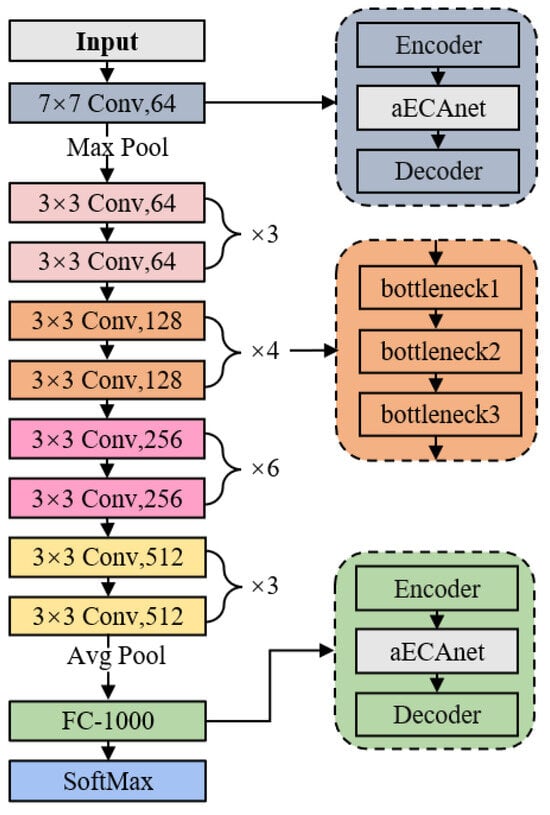 In the traditional application of the attention mechanism, there is no clear standard for the location of adding the backbone network. However, in the experiment, the location of adding the attention mechanism except the first and last layer will change the network structure, and the pre-trained weights cannot be used. Due to the use of pre-trained weights in the experiments of this paper, the attention mechanism can only be added in the middle of the encoder and decoder of the first and last layers of the ResNet34 network, and the model has the best training effect. The main structure of aECA-ResNet34 proposed in this paper is composed of ResNet34 as the backbone network, and the improved aECAnet attention mechanism is added to the middle of the ResNet34 network. From the above Figure 3, it can be seen that ResNet34 is composed of 34 convolutional layers, and the aECAnet module is added in the middle of the encoder and decoder of the first convolutional layer and the last fully connected layer of the ResNet34 network, as shown in Figure 5.