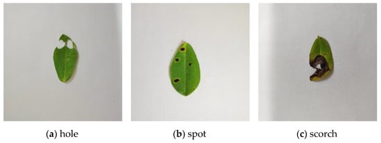 The images of the peanut dataset were taken by us, it contains 1329 images, and there are three types of diseases, namely hole, spot, and scorch disease, as shown, respectively, in Figure 6a–c. There are 466 images of hole disease, 351 images of spot disease, and 512 images of scorch disease. The peanut leaves were sourced from the experimental field of Baiquan Modern Agricultural Research Institute in Xinxiang, China (latitude 35°16′24″ N, longitude 113°56′46″ E), the shooting background was the intelligent measurement and control technology laboratory of Henan Science and Technology College in Xinxiang, China, and the shooting equipment was the Honor 30pro and the Honor 80gt cell phones produced by Honor Corporation in Shenzhen, China.