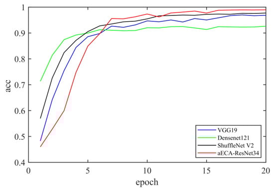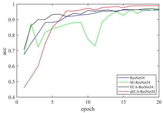 In order to verify the effectiveness of the aECA-ResNet34 model proposed in this paper, a comparison was conducted between its network performance and accuracy with that of four other models, namely ResNet34, SE-ResNet34, and ECA-ResNet34, on two datasets.