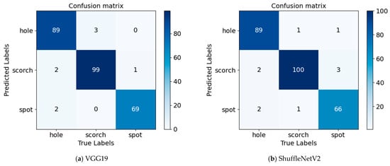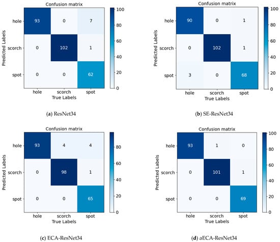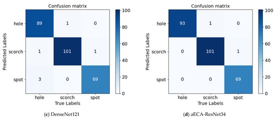 Similarly, the confusion matrixes for the classification of different networks are drawn here, as shown in Figure 10. Figure 10a–d is the classification recognition of VGG19, ShuffleNetV2, DenseNet121, and aECA-ResNet34. The results in Figure 10a,c show that the hole is easily predicted as the scorch by the networks, which may be due to the small sample size of the dataset, the spot in Figure 10b will be predicted easily by ShuffleNet V2 as scorch and hole, and aECA-ResNet34 in Figure 10d still has the best confusion matrix.