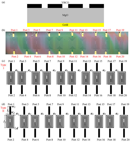 (a) A schematic diagram of the material; (b) a photograph of the circuit implementing the topologically non-trivial photonic crystal; (c) a circuit of ten indirectly coupled, topologically trivial resonators. The YBCO film has a conductivity of approximately S/m and a thickness of 600 nm. The substrate is MgO with dimensions of 47.6 mm × 10 mm × 0.5 mm, and its relative permittivity is 9.74675. The depth of the air layer below the top cover is 5 mm. The dimensions in the circuit are as follows: mm, mm, mm, mm, mm, mm, mm, and mm. The number of turns of each spiral resonator is 5. The line width and line spacing are both 0.08 mm in the spiral resonators. (d) Circuit of ten indirectly coupled, topologically non-trivial resonators.