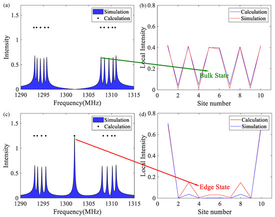 (a) Calculated eigenfrequencies (black dots) and simulated intensity with loss (blue profile); (b) local intensity profiles of the bulk state in the pass band under a topologically trivial structure (calculation: f = 1307.65 MHz; simulation: f = 1307.73 MHz); (c) calculated eigenfrequencies (black dots) and simulated intensity with loss (blue profile); (d) simulation (blue line) and calculation (red line) of the local intensity distribution of the edge state in the presence of a topologically non-trivial structure (calculation: f = 1301.86 MHz; simulation: f = 1301.86 MHz).