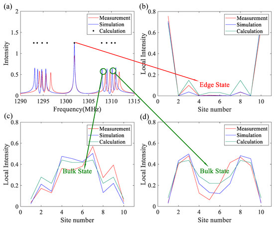 In our experimental measurements, the eigenfrequencies of a Type II (topologically non-trivial) crystal were computed, and its intensity was measured. When comparing the measured, simulated, and calculated results of the intensity with the local intensity of the Type II crystal, a good fit can be observed among them, demonstrating the reliability and accuracy of our research findings, as shown in Figure 3. The rightward shift observed in the measurement results relative to the simulation is attributed to variations in relative permittivity (see Figure 3a). Furthermore, the measurements reveal that the local intensity of the new state is highly localized at the two ends, as illustrated in Figure 3b, indicating its classification as edge states. This stands in stark contrast to the bulk state within the band, where the local intensity is primarily distributed in the bulk, as seen in Figure 3c,d.