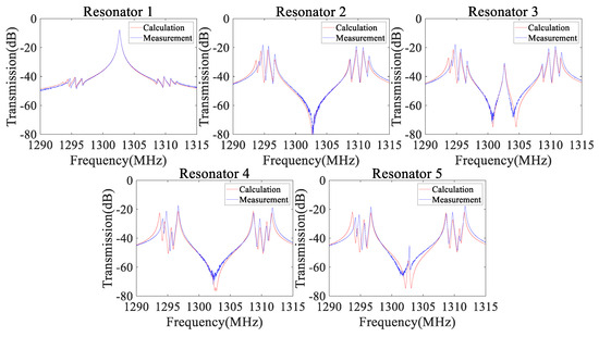 The circuit was fabricated on a MgO substrate, with YBCO HTS thin films deposited on the top surface, as depicted in Figure 1a. Photographs of the samples can be seen in Figure 1b. The experimental circuit was measured with an Agilent N5230C vector network analyzer with an input power of 0 dBm at 65 K. Cryogenic conditions were maintained by using a commercial Stirling cryocooler with an output power of 6 W. The fabricated device was secured to the cold head of the cryocooler within a vacuum chamber. The tuning of the circuit was achieved by using sapphire tuning screws on the top cover to correct any fabrication errors. Although utilizing a MgO substrate with YBCO HTS thin films deposited on the top surface provides a platform for high-precision measurements and endeavors to minimize manufacturing errors, deviations in the resonator’s frequency may still occur. These deviations might arise from various factors, such as imperfections in the fabrication process, variations in material properties, or the environmental conditions during the measurements. Tuning the circuit with sapphire tuning screws helps to correct some of these fabrication errors, but it may not eliminate all frequency deviations.
