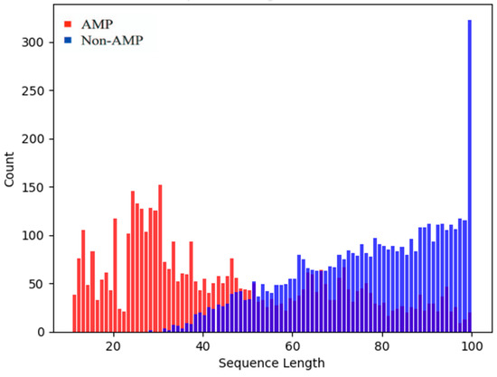 To mitigate the impact of varying data distributions across different databases, we utilized a comprehensive benchmark evaluation dataset for training and validation. This benchmark dataset comprises AMP and non-AMP peptide data, the positive data are from six different databases: APD, LAMP, CAMP, DBAASP, DRAMP, and SATPdb, the negative data was randomly extracted from UniProt. As new databases may reference data from earlier databases, leading to potential data overlap between different databases, the CD-HIT tool [20] was employed to eliminate redundant AMP and non-AMP peptides, and sequences with a similarity exceeding 90% between peptide sequences from different databases were removed. Based on the research by Yue Zhang [21] and Ke Yan [9], excessively long peptide chains may result in more complex structures, making protein synthesis challenging; conversely, overly short AMPs may lack sufficient functional sites or structural domains and are prone to degradation in the environment. Therefore, sequences with lengths ranging from 10 to 100 amino acids were selected, and excluded sequences that contained non-standard amino acids (B, J, O, U). This process resulted in a benchmark evaluation dataset comprising 4550 AMPs and 4550 non-AMPs. The lengths of AMPs typically lean towards the shorter side, predominantly falling within the range of 20–40 amino acids, the antimicrobial activity of AMPs tends to weaken with increasing length, and, as the number of amino acids increases, the quantity of AMPs gradually decreases. In contrast, non-AMPs generally exhibit greater length [7] from the sequence distribution plot of our constructed dataset, which is shown in Figure 1. This observation underscores the conformity of our dataset to the aforementioned pattern, implying that the dataset effectively captures the diverse length distribution of AMP. It is important to note that the non-AMP sequences in this dataset are longer on average than the AMP sequences, which may introduce some bias in the experiments. However, since most existing works have evaluated their models based on this dataset [11], we have also utilized it for our study.