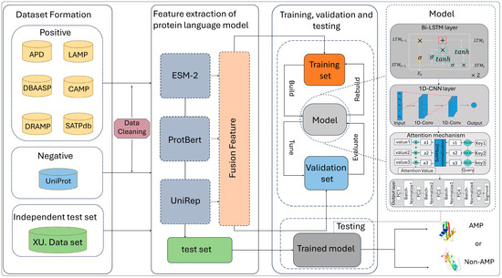 - Xing, W.; Zhang, J.; Li, C.; Huo, Y.; Dong, G. iAMP-Attenpred: A novel antimicrobial peptide predictor based on BERT feature extraction method and CNN-BiLSTM-Attention combination model. Brief. Bioinform. 2023, 25, bbad443. [Google Scholar] [CrossRef]
