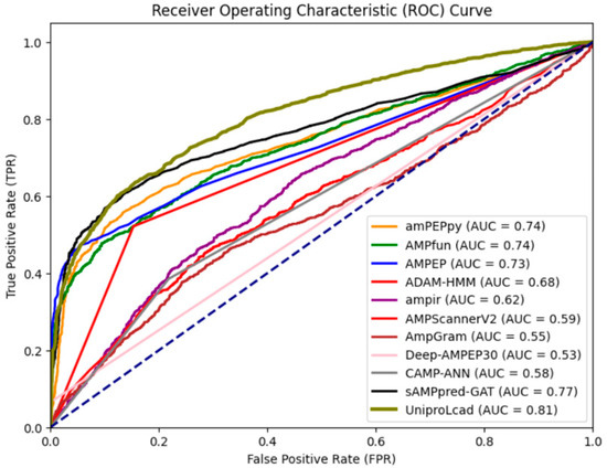 In order to ensure the advancement of our model, we compare the proposed method with nine state-of-the-art approaches on the independent XUAMP test set, and the AUC values for each model were computed on the test set. The evaluated methods include amPEPpy [38], AMPfun [7], AMPEP [39], ADAM-HMM [40], AMPIR [41], AMPScannerV2 [42], AMPGram [43], Deep-AMPEP30 [44], CAMP-ANN [4], and sAMPpred-GAT [9]. The results are detailed in Table 5, and the AUC values are visually represented in Figure 3.