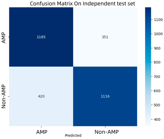 To assess the model’s generalization ability, an independent test set named XUAMP, created by Xu et al. [11], was utilized. This dataset includes 1536 AMPs and 1536 non-AMPs. The CD-HIT tool was applied to the independent test set and the benchmark evaluation dataset to remove sequences with a similarity exceeding 90%, ensuring the independence of the data and providing a more objective evaluation of the model’s generalization ability.