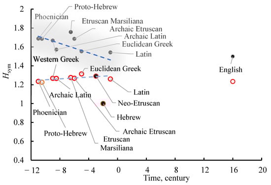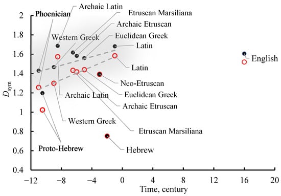 Let us address the graphs depicted in Figure 2 representing calculated for the studied scripts and the plotted vs. the date at which the scripts were first registered [,,,,]. For example, the first Etruscan text is approximately ascribed to 700 BCE []. The archaic Latin is ascribed to ca. 750 BCE [,]. Classical Latin is formed approximately in approximately the 1st century BCE [,]. The graphs established for the scripts inscribed into the square (represented with gray circles and abbreviated s-scripts) and the graphs established for the letters/graphemes inscribed into rectangles (abbreviated r-scripts) are depicted. It is recognized from the graphs presented in Figure 2 that calculated for the s-scripts is decreased with time, whereas is only slightly time-sensitive for r-scripts. Let us explain this result: the average uncertainty to find an element of symmetry within the symbols of the given alphabet (averaged over the entire alphabet) decreases with time for s-scripts, and it is constant for the r-scripts. The interpretation of this conclusion needs some care; indeed, is not a monotonic function of , and indeed when and also when []. A low value of may illustrate the absence of symmetry in the letters of the alphabet, and this the case with the Hebrew alphabet, for which calculated for both s- and r-Hebrew scripts is very low and it is out of the trend lines, shown in Figure 2. calculated for modern English letters and supplied for the comparison in Figure 2 is not far from those established for the Phoenician-rooted scripts, and it is very close to calculated for the Latin script.