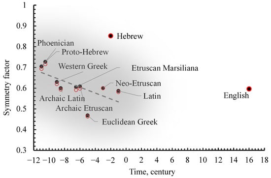 The regression line crosses the time axis at the point . Let us take a close look at the plot, presented in Figure 6. We come to the following conclusions: (i) points representing rectangular and square scripts are located very close to each other for all of the studied scripts emerging from the Phoenician alphabet; (ii) symmetry factor decreases with time. This means that the averaged level of symmetrization of the studied alphabet increases with time, and the parsimony of graphical information necessary for writing consequently increases with time. And, again, the high value of the symmetry factor established for Hebrew presents the obvious exception.