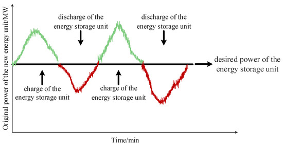 where Pref is the expected grid-connected power of the renewable energy generation system, and Pw and PPV are the uncontrollable original power of the wind and photovoltaic fields. When Pref > Pw + PPV, the energy storage system releases its stored energy to make up the difference between them. When Pref < Pw + PPV, the energy storage system absorbs excess power. The principle is illustrated in Figure 3.