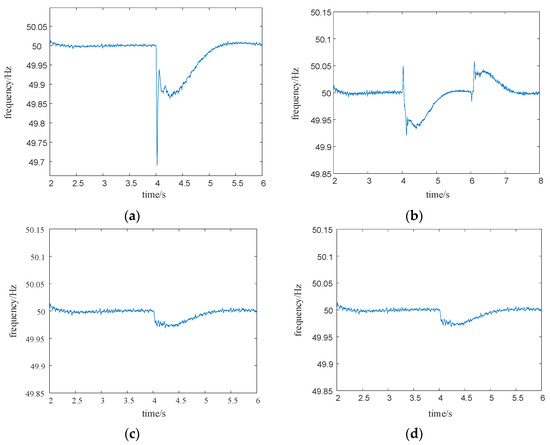 The frequency response under different perturbations: (a) Load surge; (b) Illumination perturbation; (c) Wind speed disturbance; (d) Insufficient storage.