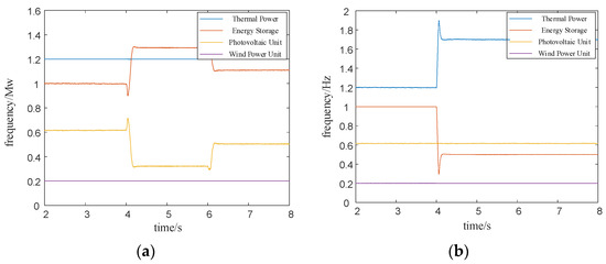 Figure 11 illustrates the system response during an emergency situation when the power support of units is insufficient due to a sudden load increase. In this scenario, for rapid support, priority is given to the energy storage units to act first, slowing down the frequency drop and raising the minimum frequency point. The wind and solar units remain unchanged, followed by the thermal power units providing power support for primary frequency regulation. From the power output variations of each unit Figure 11a, it can be observed that during the three load spikes at 4 s, 5 s, and 6 s, the energy storage units can quickly increase their output power to achieve the expected results. Energy storage unit 1, with a higher SOC, rapidly increases power support during each disturbance. Energy storage unit 2 operates in the third-class state, only increasing power support when the system power support is insufficient, ensuring the supply time. This validates the effectiveness of the proposed strategy. The thermal power unit responds slightly slower than the energy storage unit when participating in power support. At 6 s, facing another load increase, both types of energy storage cannot further increase power support as they have reached their maximum discharge power. At this point, when the frequency drops below 49.5 Hz, load-shedding measures are implemented, and the thermal power unit subsequently provides power support. The load-shedding value is determined according to Section 2.2, and in this study, nearly 0.4 MW is shed. Compared with the control without load cutting measures, the stability of system is maintained at the cost of 0.4 MW.