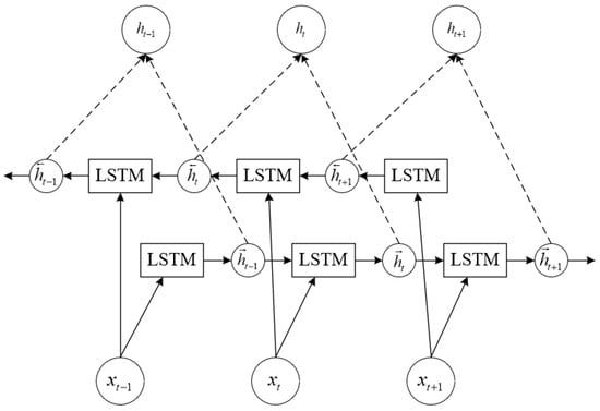 The BiLSTM constructed in this paper consists of two independent LSTMs, namely the forward LSTM and the backward LSTM. Simultaneously considering information from past and future sequences, the final learning result is obtained by combining the forward input sequence and the reverse input sequence with certain weights. The specific model structure is illustrated in Figure 1. To be specific, if , and are input variables, after going through the forward LSTM, we obtain hidden vectors , and . At the same time, the same input sequences undergo the backward LSTM, yielding hidden vectors , and . Further, concatenating the forward hidden vectors with the backward hidden vectors results in the output of the BiLSTM, represented by , and .