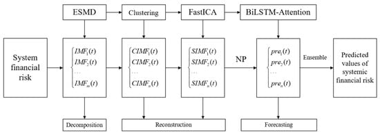 We combined extreme-point symmetric empirical mode decomposition (ESMD), hierarchical clustering and fast independent component analysis (HFastICA), bidirectional long short-term memory (BiLSTM), and attention mechanism, taking into account the crucial indicator of network public opinion. It constructs a novel “decomposition–clustering-ensemble” model for systematic risk prediction. Figure 2 illustrates the structure of the prediction model.