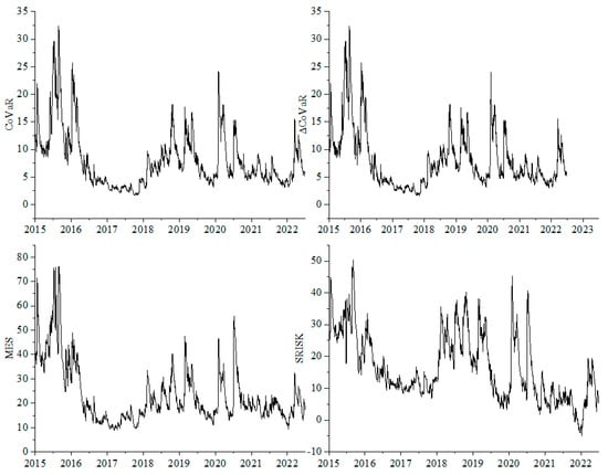 We measured China’s systemic financial risk from various perspectives using conditional value at risk (CoVaR), conditional value at risk difference (∆CoVaR), marginal expected shortfall (MES), and the capital shortfall risk index (SRISK). CoVaR emphasizes the risk spillover of individual financial institutions to others or the entire market. ∆CoVaR reflects the difference between CoVaR when a single institution is in an extreme state and when the system is normal. MES reflects the marginal contribution of individual financial institutions to systemic risk during a significant market return decline. SRISK reflects systemic risk from the expected capital shortfall perspective.