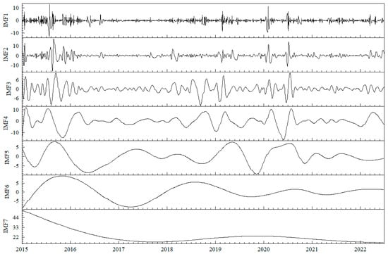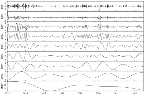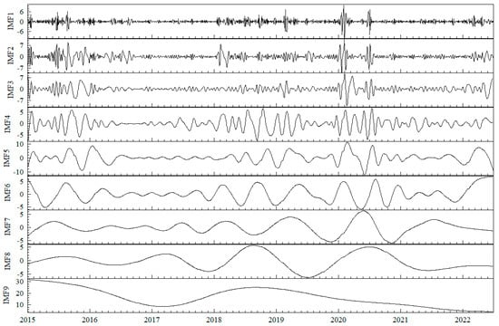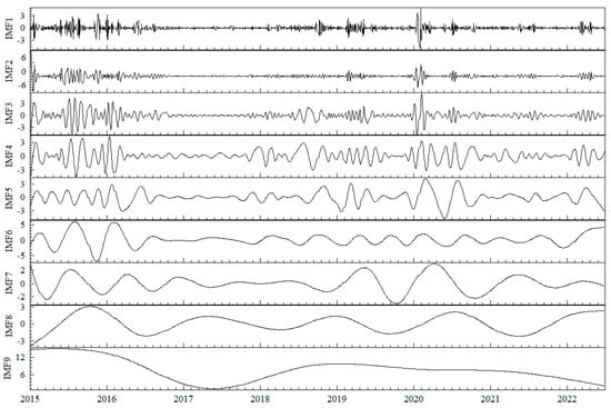 Before conducting the prediction of systemic financial risk, this paper preprocessed the systemic financial risk data through decomposition, clustering and reconstruction to fully exploit the data information. To reconstruct the data, the relevant steps of ESMD were applied to decompose CoVaR, ∆CoVaR, MES, and SRISK. Figure 5, Figure 6, Figure 7 and Figure 8 depict the decomposition results for the four types of systemic financial risk. CoVaR, ∆CoVaR, MES, and SRISK were decomposed into 9, 9, 7, and 9 intrinsic mode functions (IMFs), respectively. Among these, the frequency of each mode from IMF1 to IMF9 (IMF7) gradually decreased, with IMF1 having the highest frequency and the smallest amplitude, which can be considered as representing random factors. IMF2 to IMF6 (MES is IMF2 to IMF4) exhibited normal frequencies and amplitudes. IMF7 to IMF8 (MES is IMF5 to IMF6) represent low-frequency data, reflecting the long-term changes in systemic financial risk. The last mode (i.e., residual) was smooth and changed slowly, reflecting the overall trend of the systemic financial risk. It reached its highest point in 2015, experienced a significant decline thereafter, rose again after 2018, and then gradually decreased with slight fluctuations in 2022.